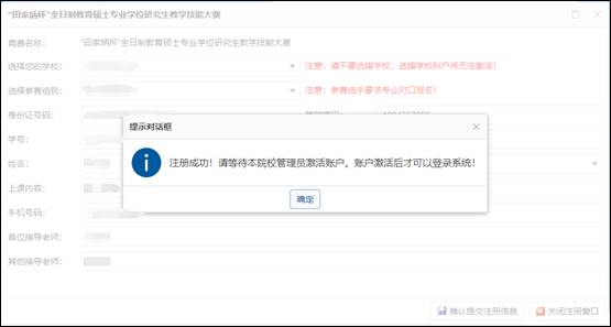点击“确认提交注册信息”后,弹出下方提示对话框,需等待管理员审核信息后激活账号后选手方可登录。(激活账号后无提示信息,请参赛选手稍等片刻)